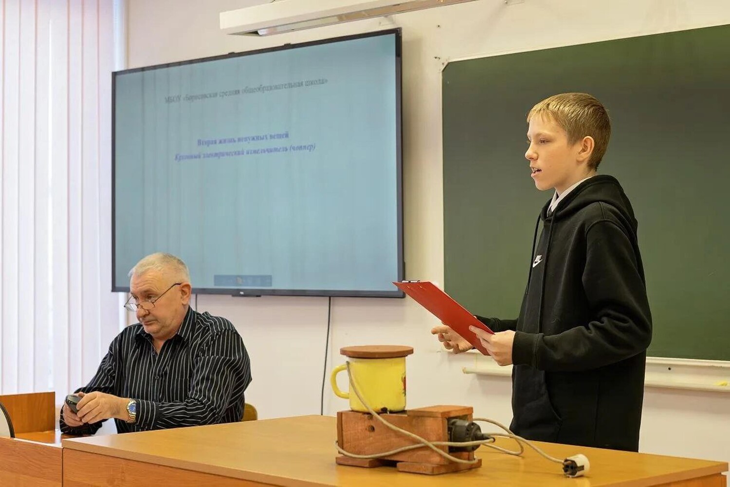 Зюкин Сергей, 8 класс, Борисовская школа, проект «Бытовой электрический измельчитель», руководитель Ботенко Евгений Николаевич, учитель технологии. Гриднева Валерия и Гришина Виолетта, 5 класс, Банновская школа, проект «Очистка семян от примесей по величине», руководитель Сорокина Вера Дмитриевна, учитель химии, биологии.